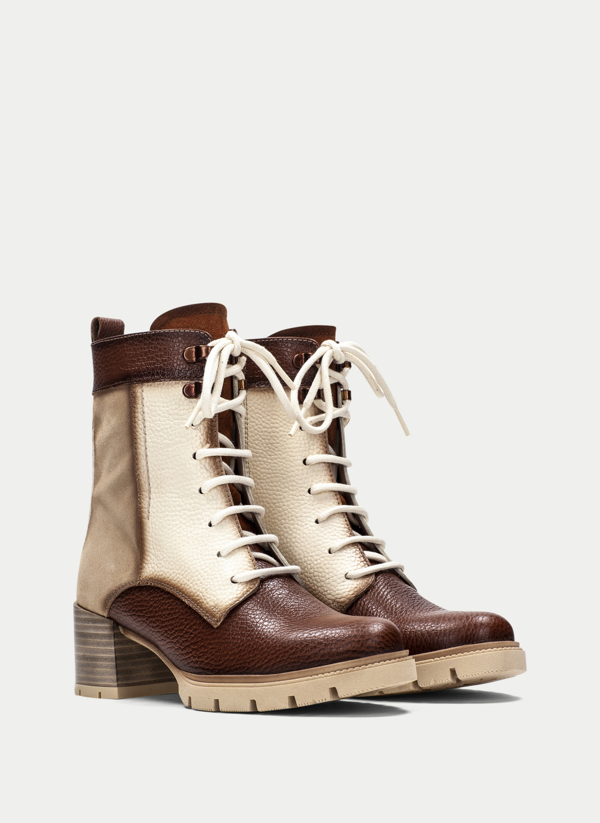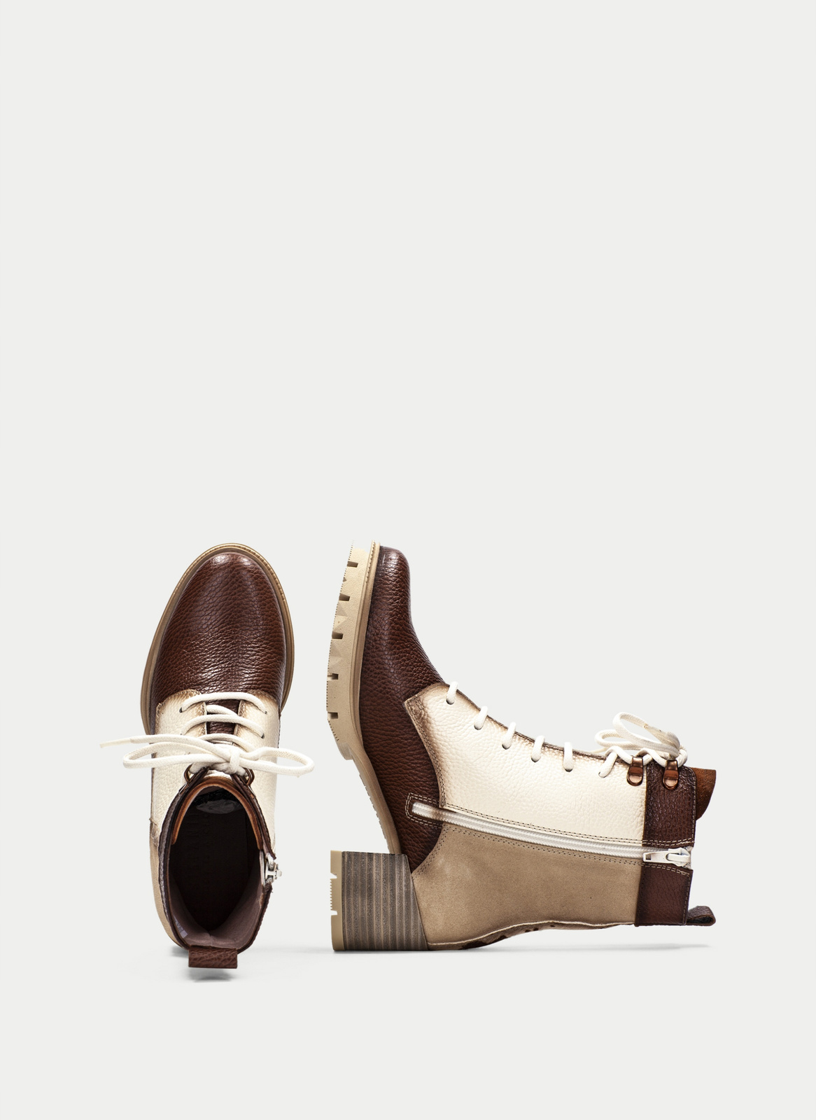 - Botki od marki Hispanitas wykonane z połączenia wysokogatunkowych skór zamszowej i licowej w odcieniach brązu i beżu