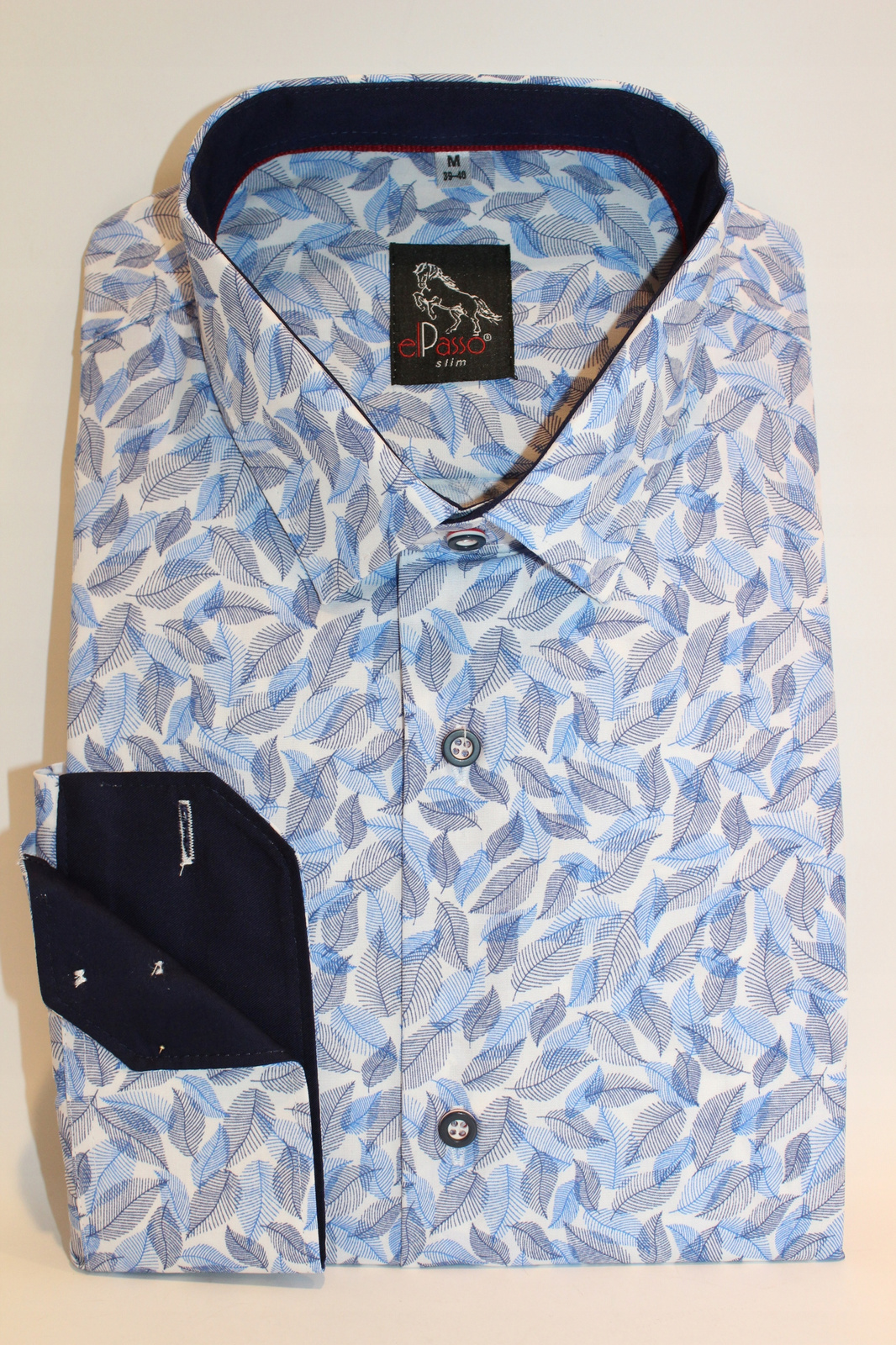 Super męska koszula z długim rękawem marki elPasso wykonana z wysokiej jakości bawełny z domieszką elany w kolorze białym. Całość ozdobiona niebiesko-granatowymi listkami. Wnętrze kołnierza i mankietów w kolorze granatowym. Guziczki biało-granatowo-czerwone świetnie dopełniają całość.