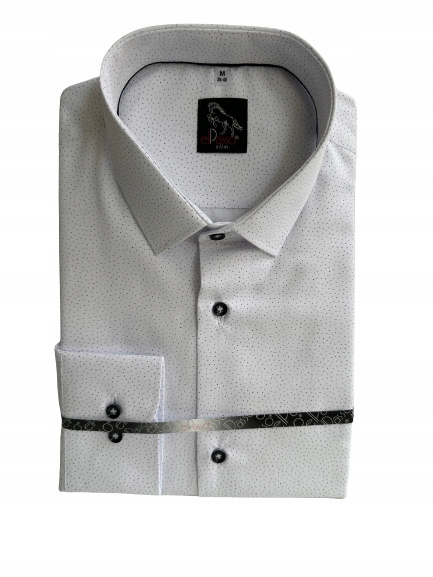 Elegancka, męska koszula z długim rękawem marki elPasso wykonana z wysokiej jakości tkaniny w kolorze białym z delikatnymi, granatowymi groszkami.