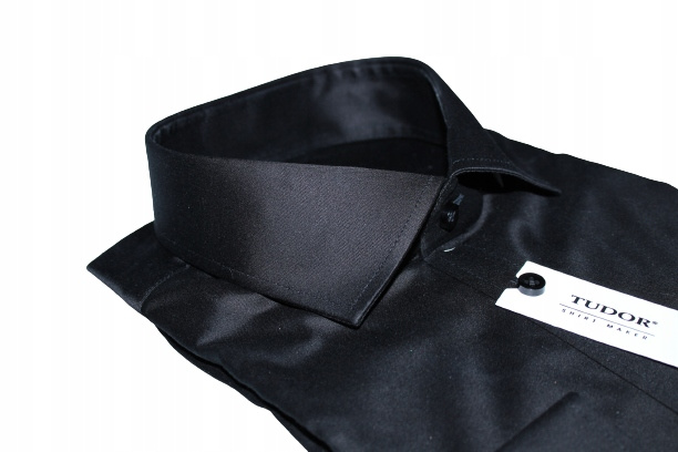 Koszula męska z długim rękawem marki TUDOR z linii Platinium, wykonana z wysokiej jakości tkaniny w kolorze czarnym. Koszula posiada czarne guziki. Kołnierzyk typu włoskiego z możliwością przypięcia od spodu. Tkanina z delikatną, satynową poświatą, w zależności od kąta padania światła.