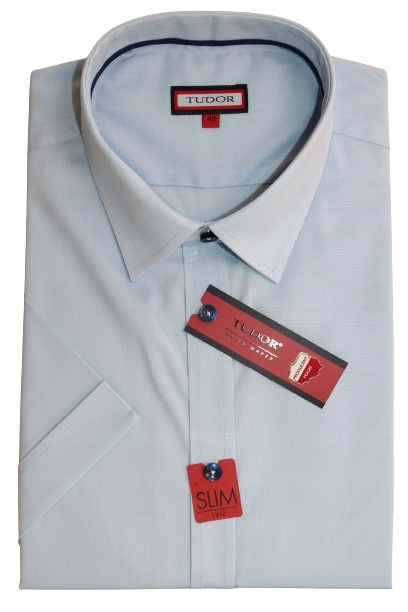 - Męska, klasyczna koszula z krótkim rękawem marki TUDOR wykonana z wysokiej jakości tkaniny w odcieniu błękitnym.