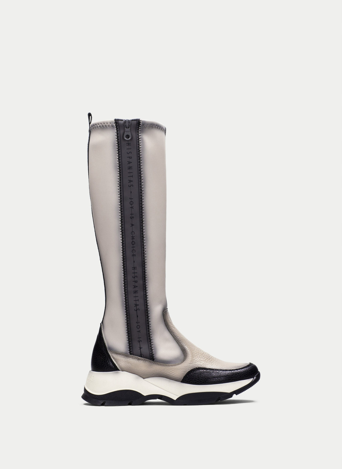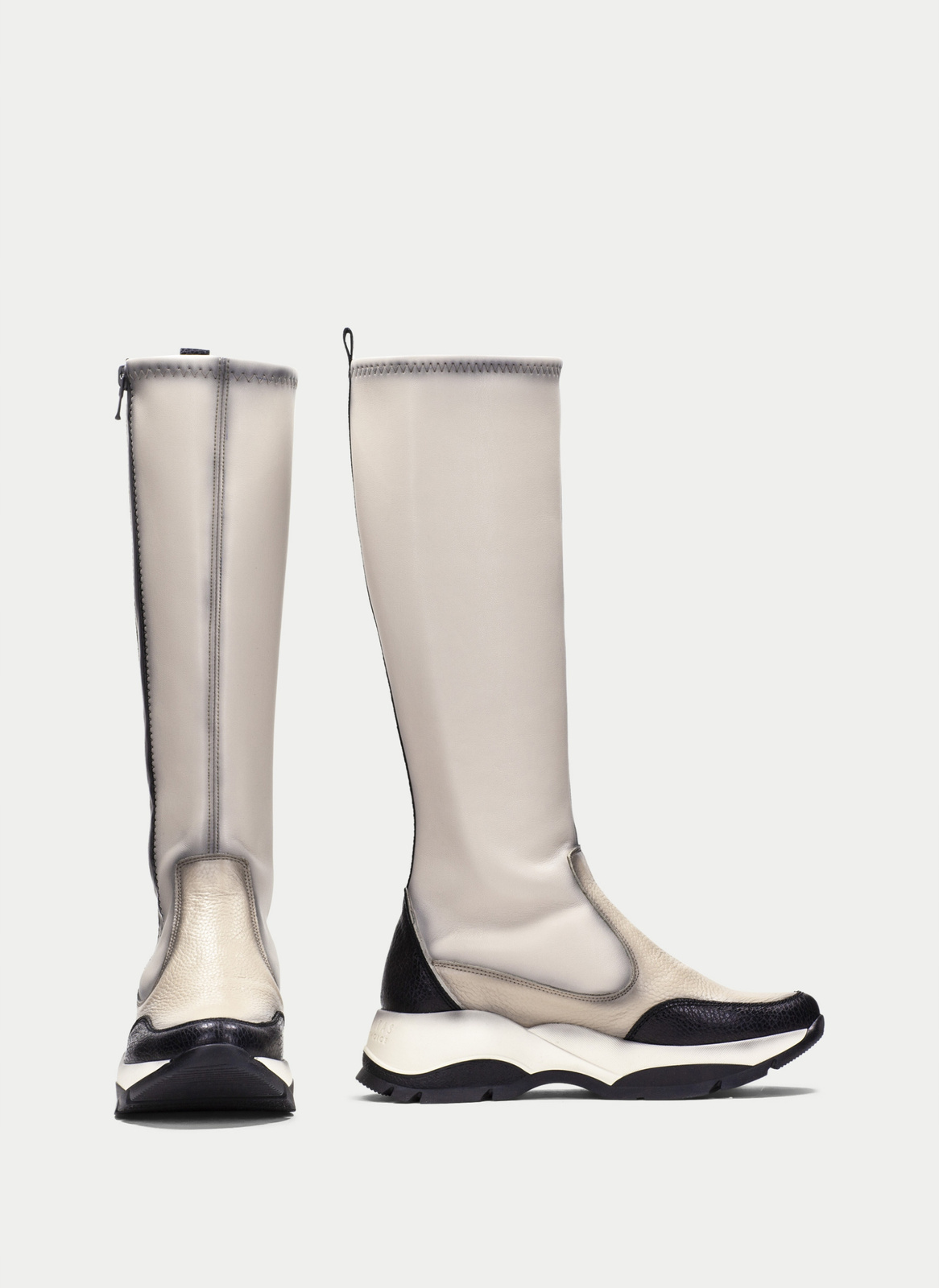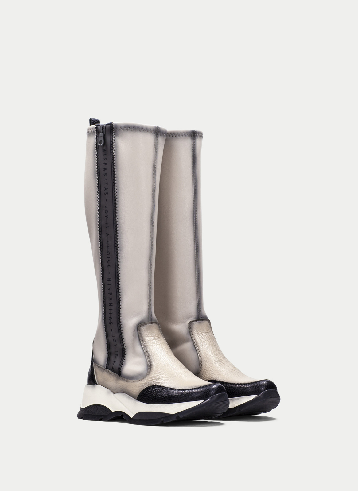 - Świetne kozaki marki Hispanitas wykonane z wysokogatunkowej skóry w połączeniu z materiałem stretchowym w odcieniach beżu i czerni.
