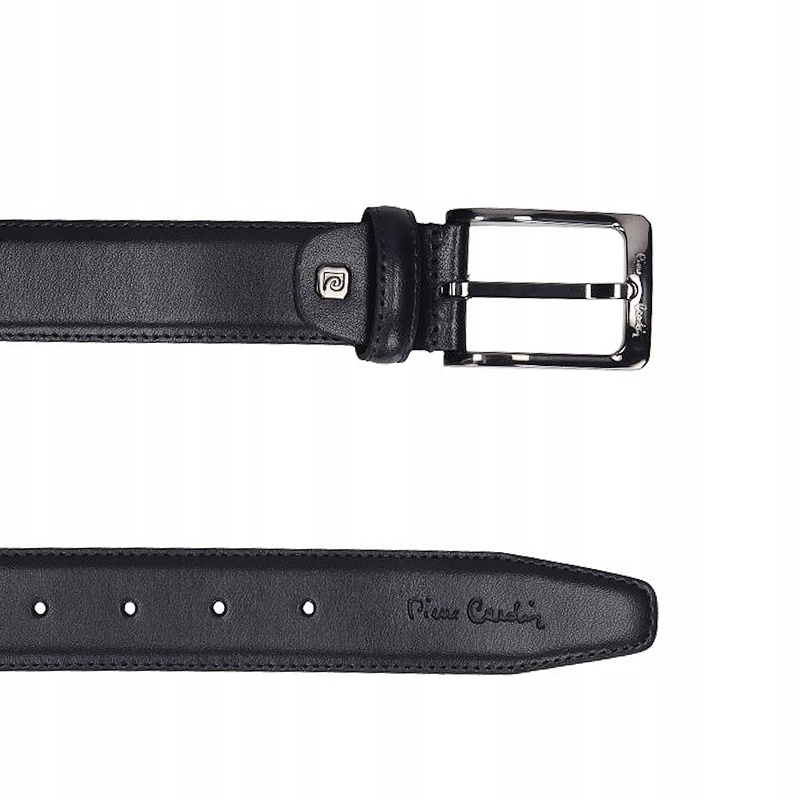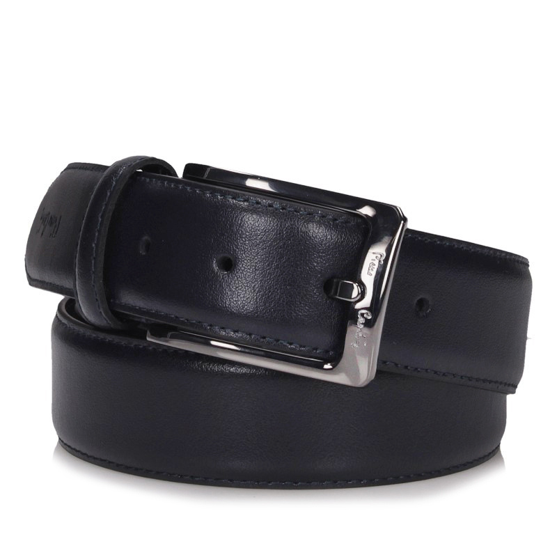 - Pasek męski o gładkim wykończeniu w kolorze ciemnego granatu. Zapinany na klasyczną, ciemno-srebrną klamrę.