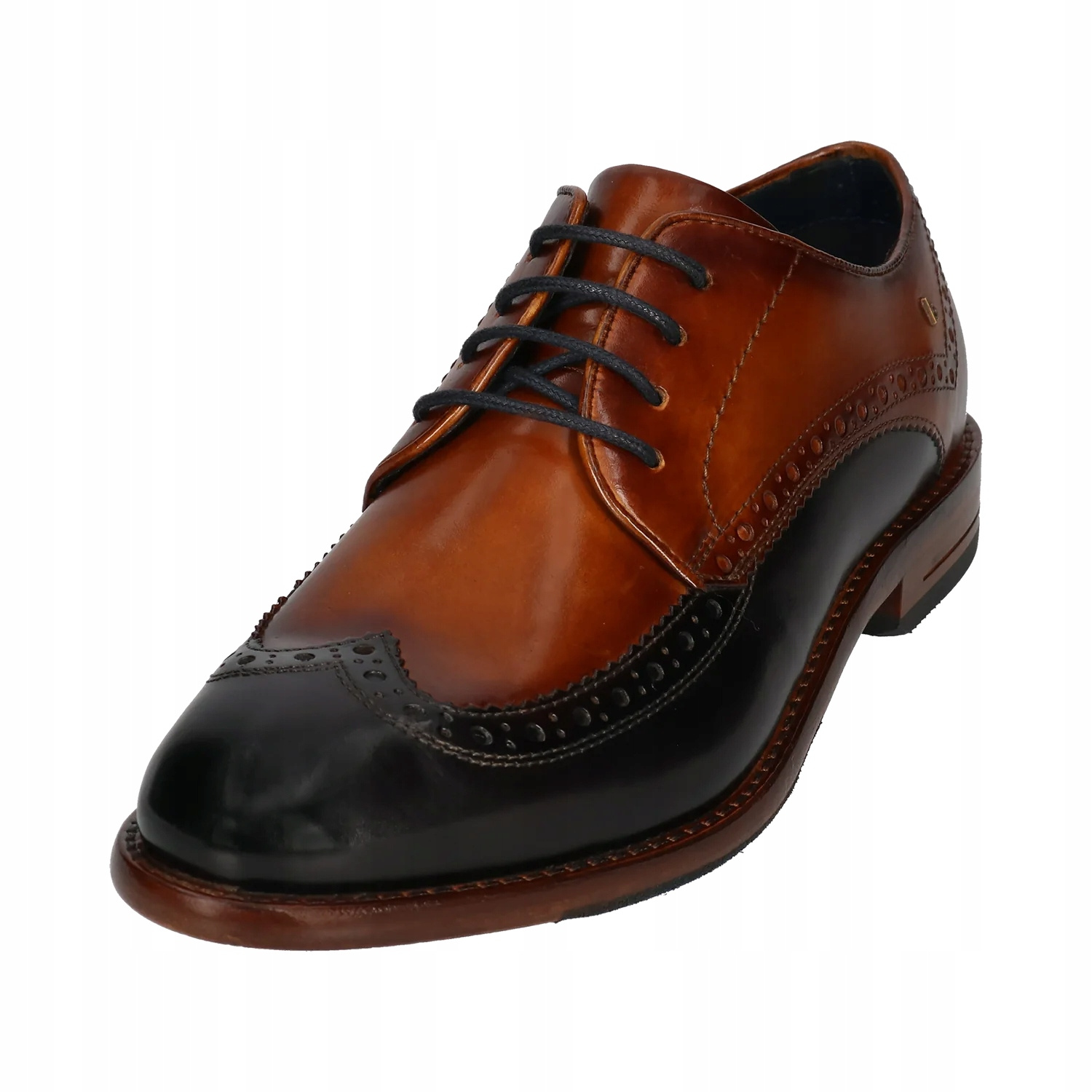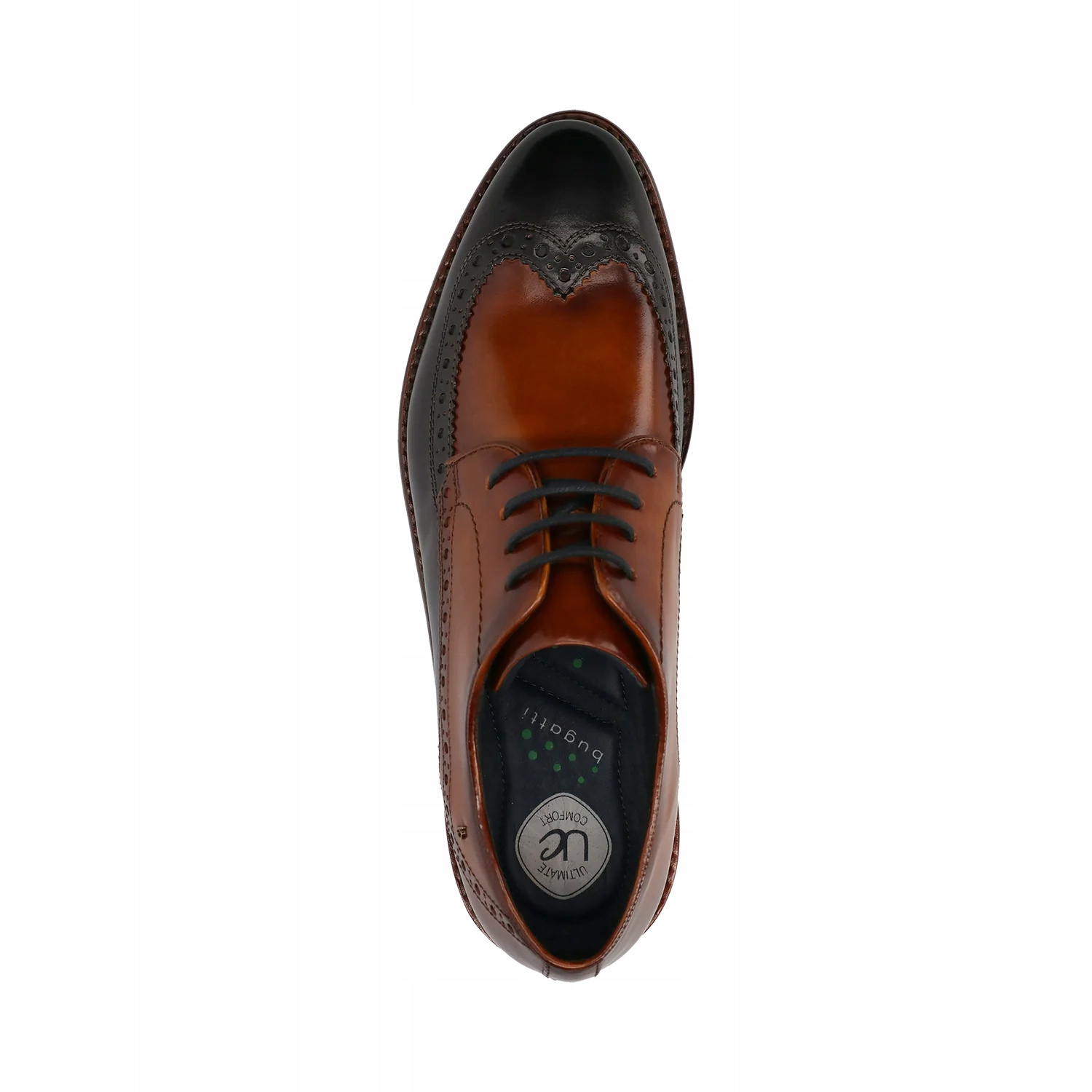 - Elegancki fason męskich półbutów marki Bugatti, wykonany z wysokogatunkowej, cieniowanej skóry licowej w odcieniach koniakowego brązu oraz ciemnej szarości z domieszką granatu.