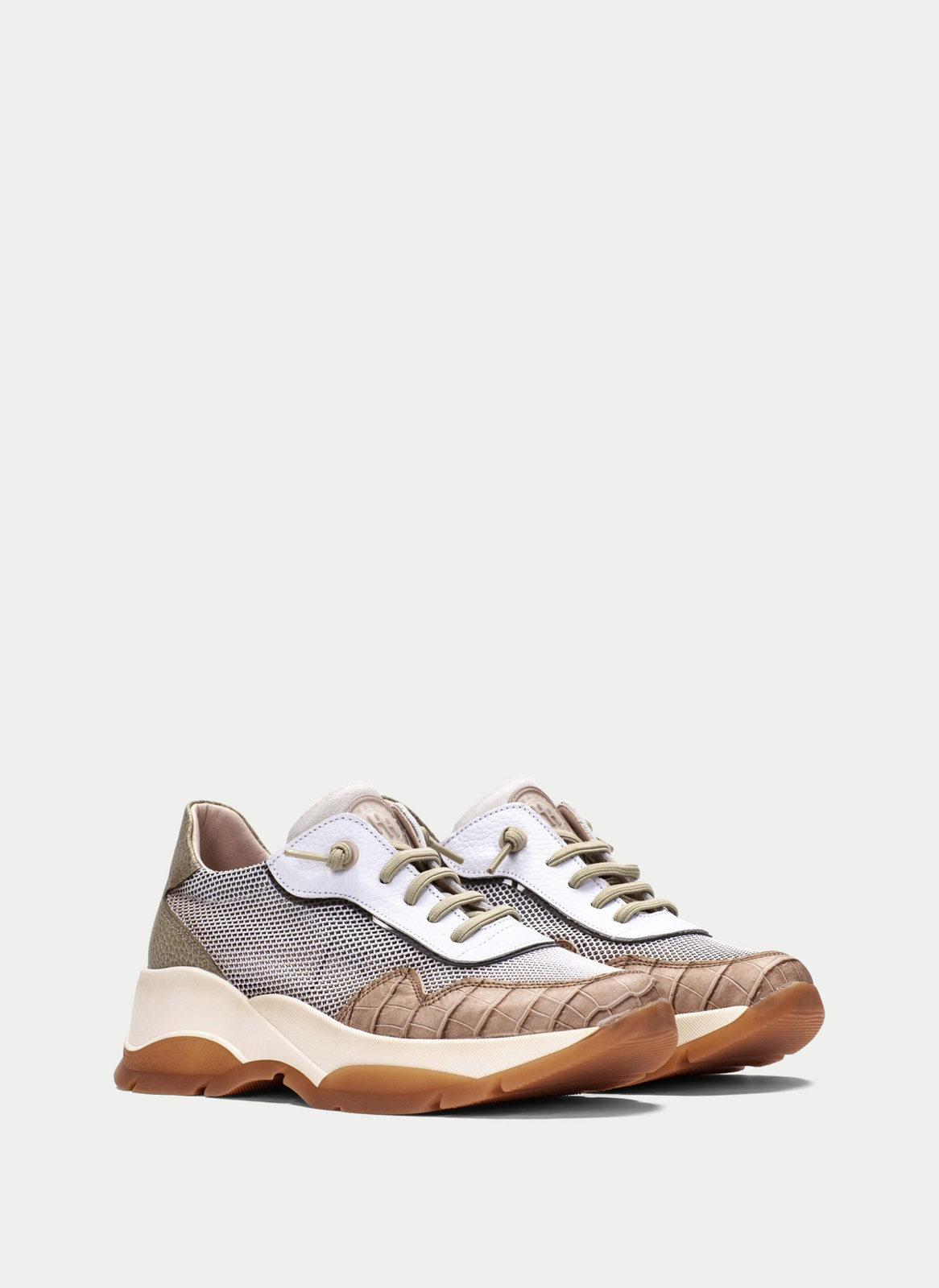 - Sneakersy od hiszpańskiej marki Hispanitas wykonane z wysokogatunkowej skóry naturalnej w połączeniu z tkaniną w kolorach: białym, beżowym oraz oliwkowym.