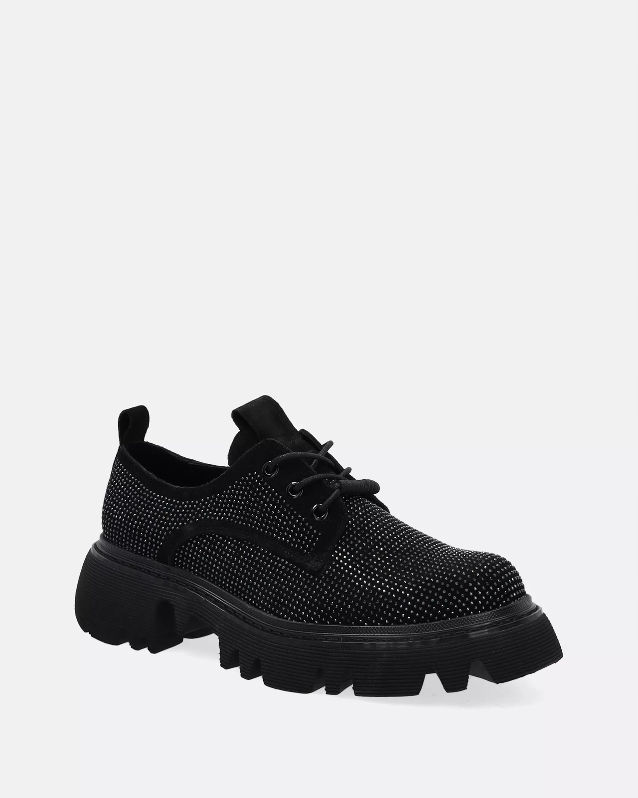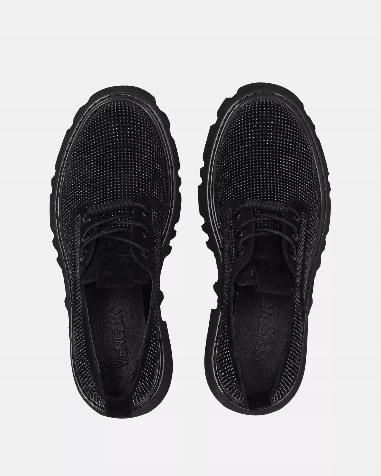 - Półbuty od marki Venezia wykonane z wysokogatunkowej skóry cielęcej zamszowej w kolorze czarnym.