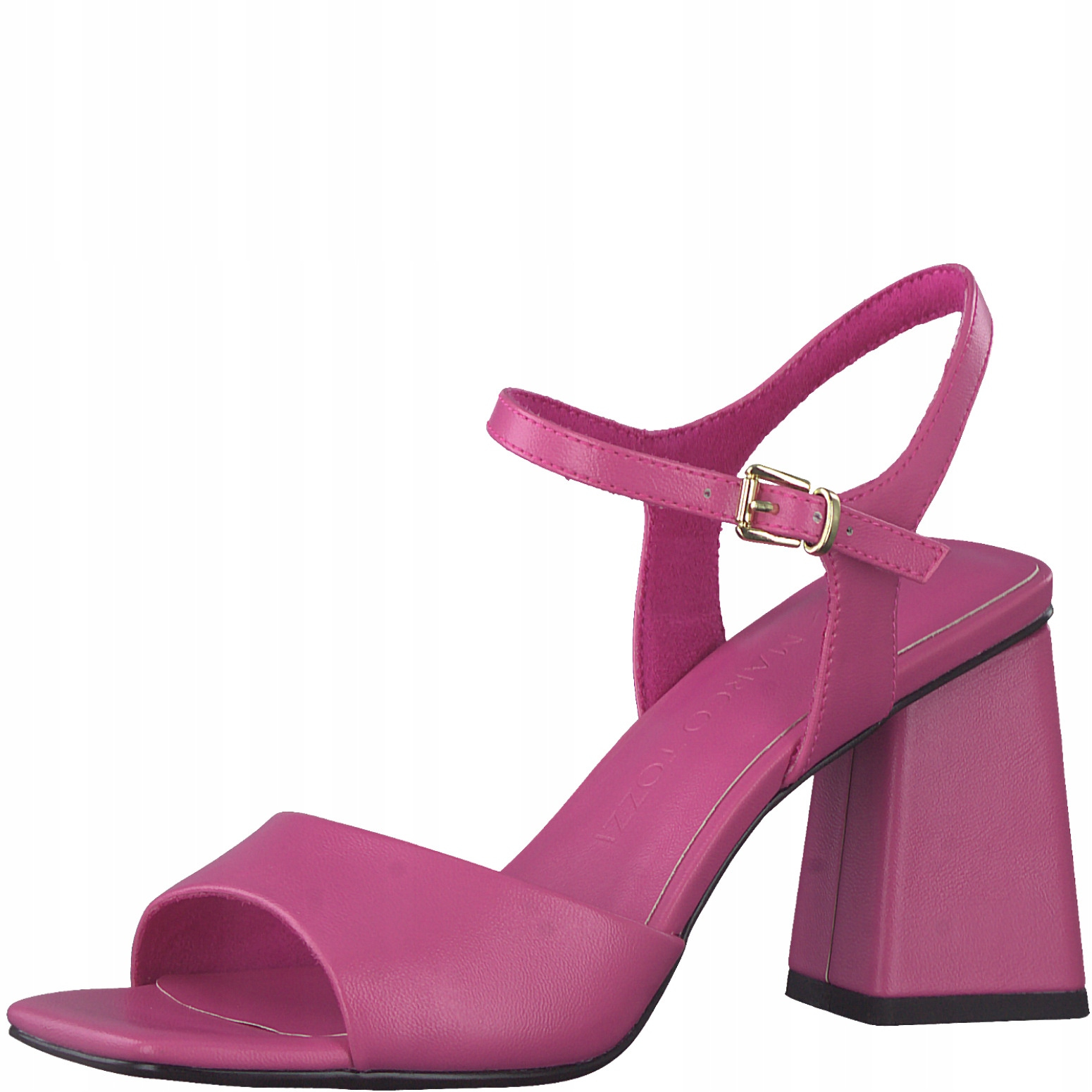 - Sandały od marki Marco Tozzi wykonane z wysokogatunkowego tworzywa imitującego skórę w odcieniu mocnego, pięknego różu