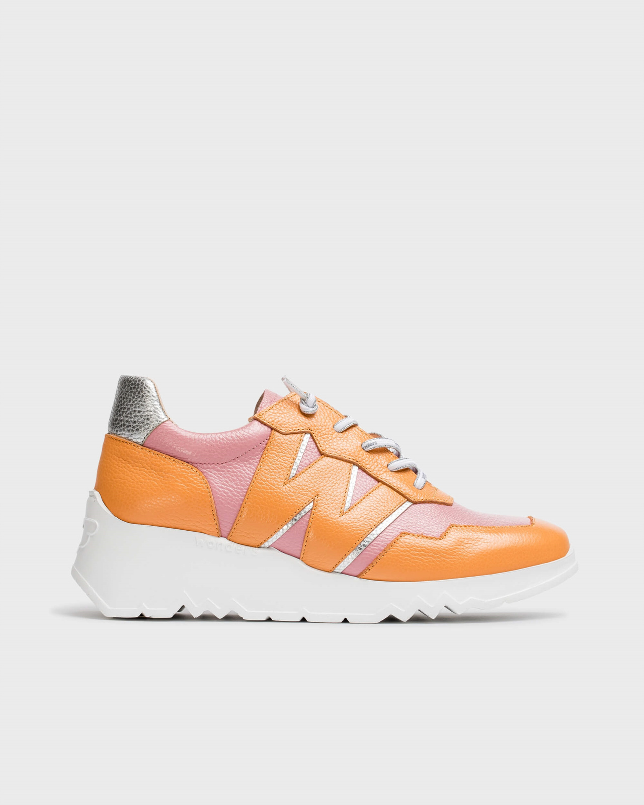 - Najnowszy model sneakersów od hiszpańskiej marki Wonders wykonany z wysokogatunkowej skóry licowej w pięknym połączeniu kolorów: brzoskwiniowej pomarańczy z różem i srebrem.