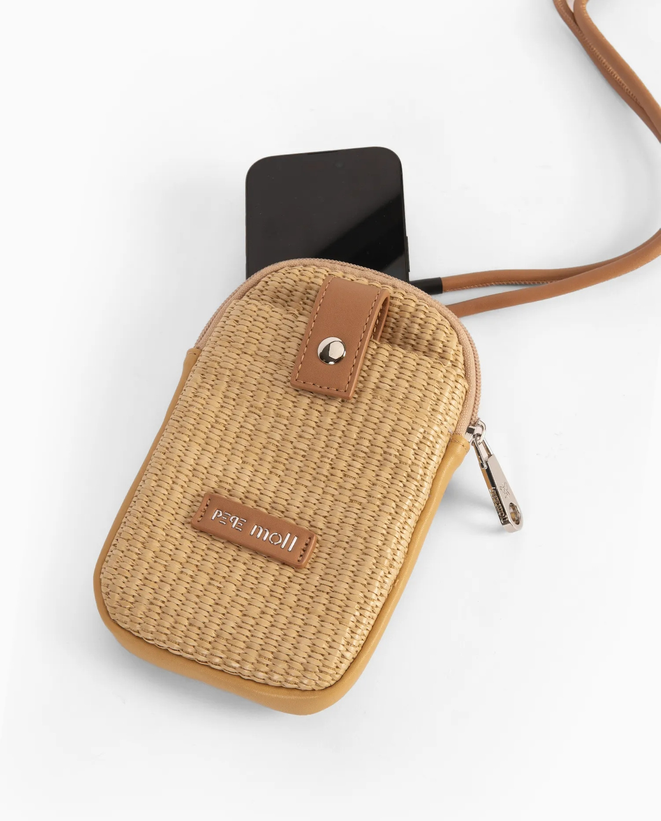 Mała torebka, etui na telefon komórkowy bądź inne niezbędne rzeczy od Pepe Moll wykonana z rafii. Fason zapinany na zamek z dodatkową kieszonką w przodzie. Pasek bez regulacji z możliwością odpięcia.