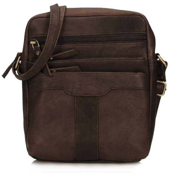 - Torebka wykonana z naturalnej, włoskiej skóry, wyposażona w jedną główną komorę zamykaną za pomocą zamka, zawierającą wewnątrz dwie mniejsze kieszonki oraz trzy dodatkowe na zewnątrz. Produkt zawieszony jest na regulowanym pasku. Dno przedmiotu jest usztywniane.