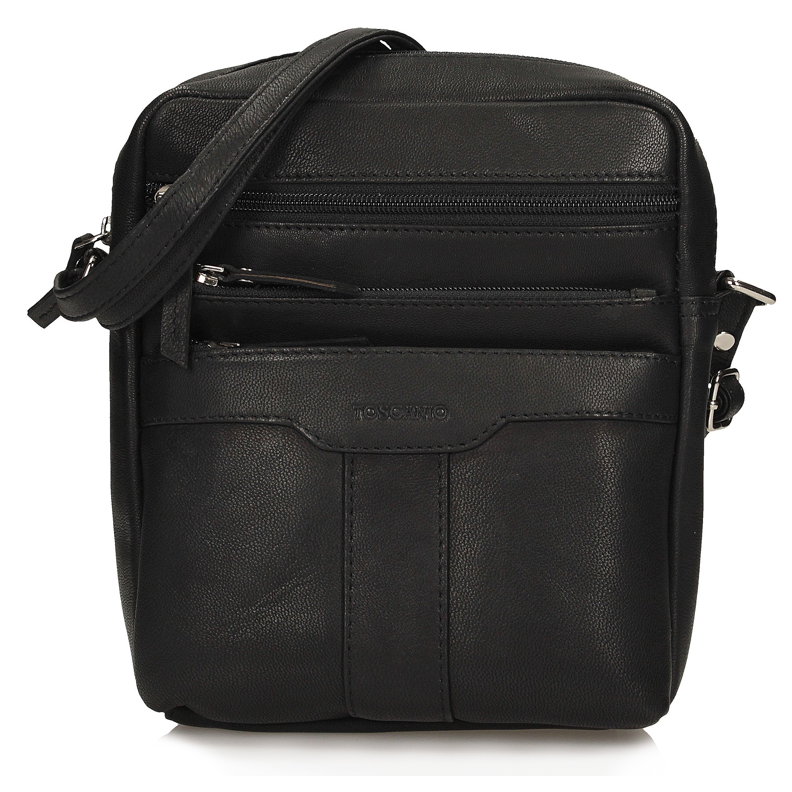 - Torebka wykonana z naturalnej, włoskiej skóry, wyposażona w jedną główną komorę zamykaną za pomocą zamka, zawierającą wewnątrz dwie mniejsze kieszonki oraz trzy dodatkowe na zewnątrz. Produkt zawieszony jest na regulowanym pasku. Dno przedmiotu jest usztywniane.