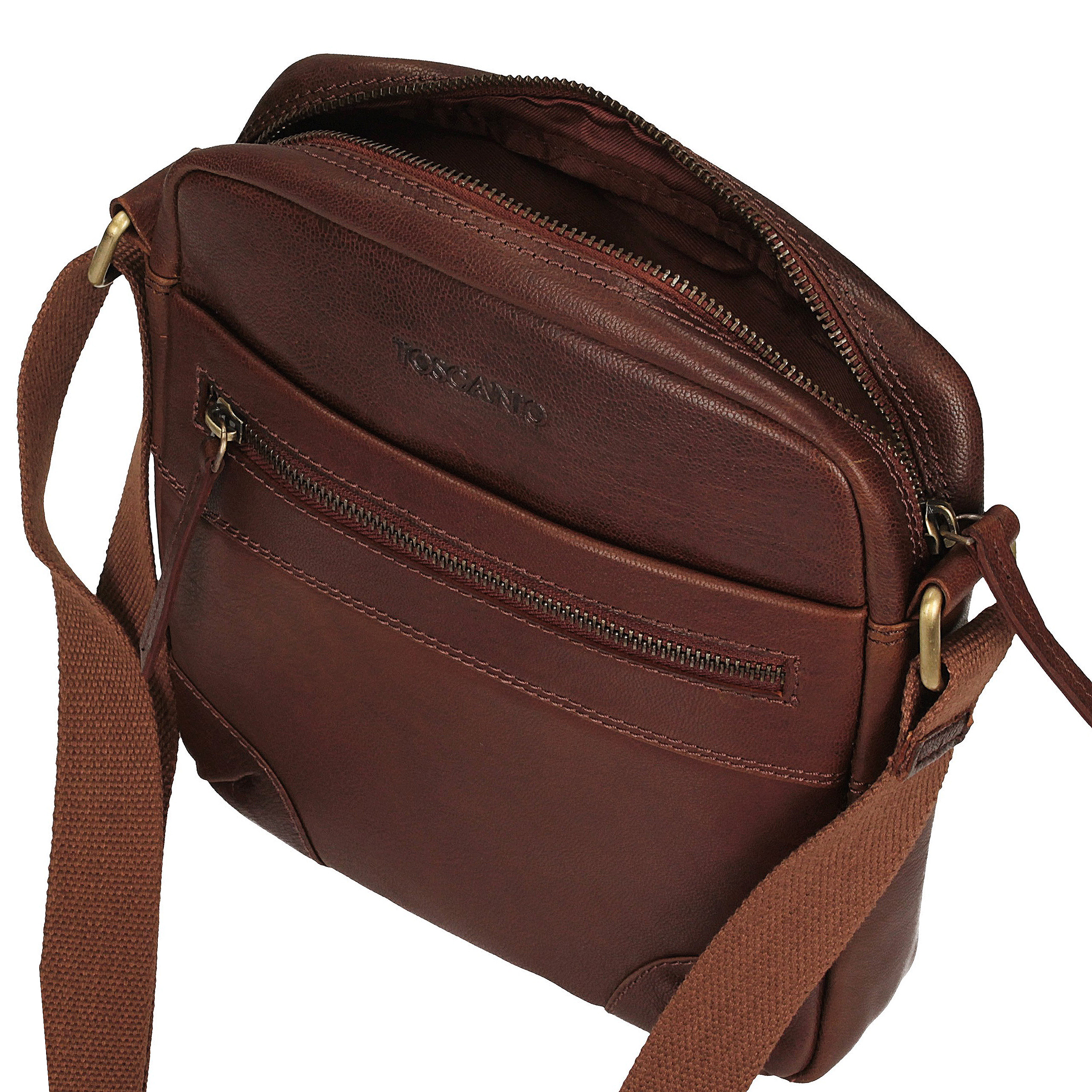 - Torebka wykonana z naturalnej, włoskiej skóry, wyposażona w jedną główną komorę zamykaną za pomocą zamka, zawierającą wewnątrz dwie mniejsze kieszonki oraz trzy dodatkowe na zewnątrz. Produkt zawieszony jest na regulowanym pasku. Dno przedmiotu jest usztywniane.